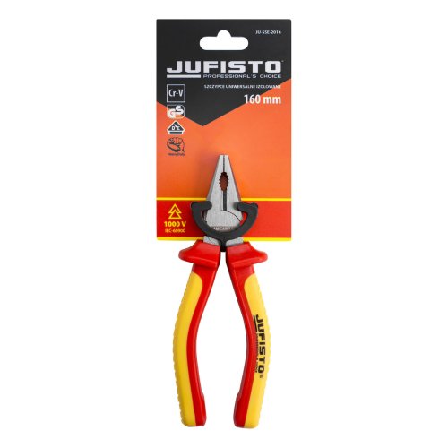 Izolované univerzální kleště 160 mm / 6", 1000 V s certifikací VDE / GS. Dvoubarevná rukojeť TPE, použitelná od -25 ± 3 stupňů do 70 stupňů.