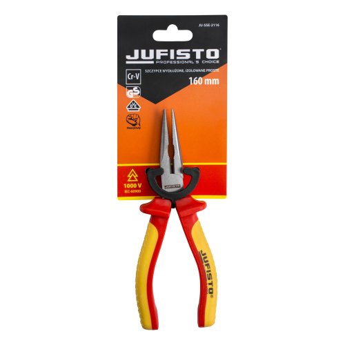 Izolované podlouhlé kleště 160 mm / 6“, 1000 V s certifikací VDE / GS. Materiál 60CrV w / leštěné, kalené, tvrdost ostří cca 58-62 HRC. Dvoubarevná rukojeť TPE, lze použít od -25 ± 3 stupňů do 70 stupňů.