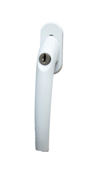 Hliníková uzamykatelná okenní klika se zinkovým jádrem. Uzamčení pouhým zatlačením vložky do kliky. Možnost uzamčení i při svislé poloze větrání. Aretace kliky po 45°.