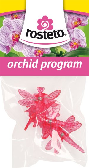 Dekorativní klipsy ve tvaru vážky slouží k uchycení květního stvolu orchidejí k opěrné tyčce. Jsou balené po 4 ks v igelitovém sáčku s EURO závěsem - pro možnost zavěšení na stojan.
