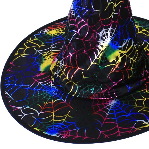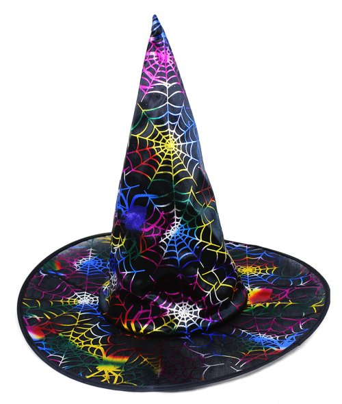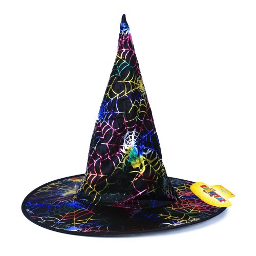 Karnevalový klobouk černé barvy zdoben barevnými magickými pavučinami je určen pro dospělé.
