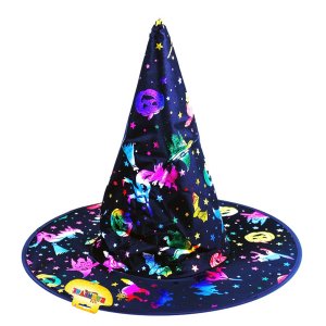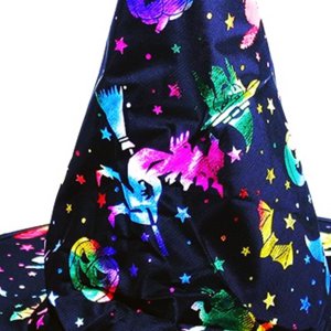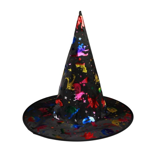 Čarodějnický klobouk pro dospělé! Klobouk černé barvy je vysoký 34 cm a zdoben barevnými magickými symboly. Staňte se hvězdou karnevalového večírku díky tomuto nepřehlédnutelnému klobouku a ohromte tak všechny své přátele!