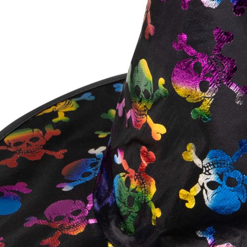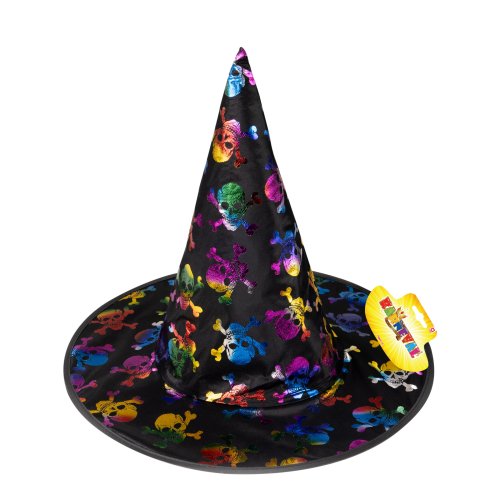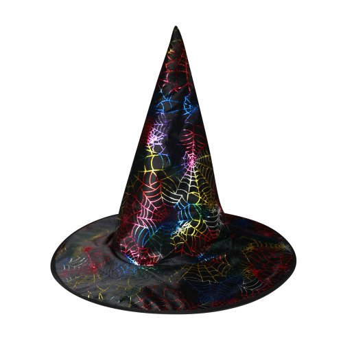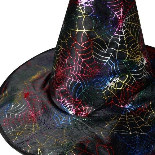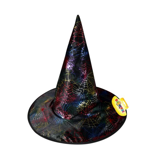 Kouzelný klobouk černé barvy zdoben barevnými magickými pavučinkami. Tento klobouk je určen pro dospělé a je ideální na čarodějnickou nebo halloweenskou oslavu.