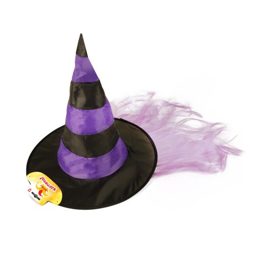 Čarodějnický klobouk černo-fialové barvy je dekorován světle fialkovými vlasy. Perfektní doplněk na Halloween párty nebo karneval!