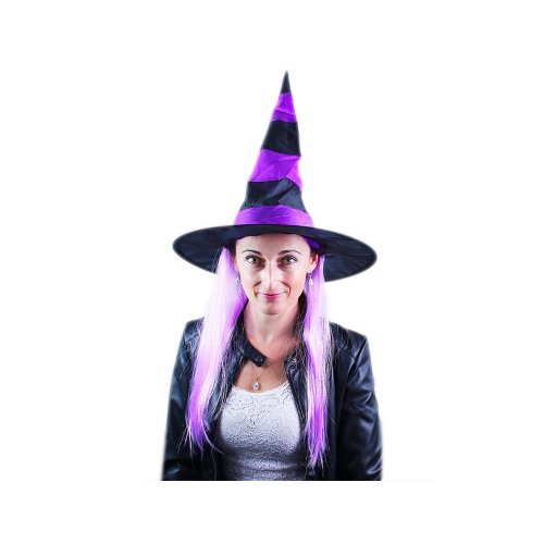 Čarodějnický klobouk černo-fialové barvy je dekorován světle fialkovými vlasy.