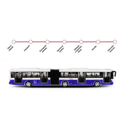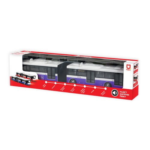 Originální autobus, který oznamuje zastávky v českém jazyce, je rozhodně ten pravý dárek pro vaši jízdu! Vaše děti si ho zamilují! Všechny dveře, lze manuálně otevřít a zavírají se pomocí posuvníků umístěných ve spodní části vozu. Při otevření předních dveří se ozve hlášení zastávky, při zavření zahlásí příští zastávku a navíc blikají přední světla. Po zatlačení na přední část střechy vydává autobus zvuk motoru. Je vyroben z plastu v měřítku 1:43, jeho délka je 36 cm a vyžaduje použití 3 ks baterií LR44/AG13, které jsou jeho součástí. Autobus jezdí na zpětný chod a hlásí celkem 7 zastávek česky. Tato unikátní hračka nadchne všechny kluky i holky!