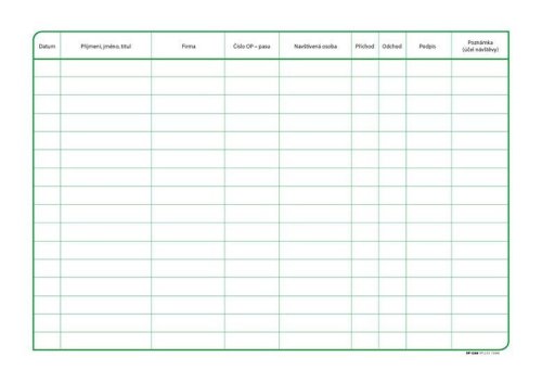 Kniha návštěv - nepropisující tiskopis - nečíslovaný - formát A4 na šířku - zelená obálka - blok 32 listů FormátA4 Samopropisovací:Ne Číslovaný:Ne Počet listů:32