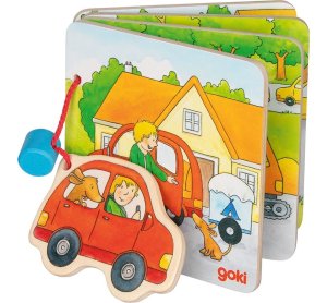 Dětská dřevěná knížka s 8 obrázky o rodinném výletě a malým obrázkem červeného auta.