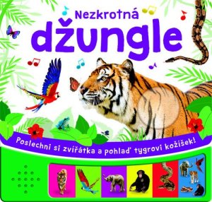 Zvuková knížka Nezkrotná džungle představuje zvířátka, jako je tygr, papoušek, slon nebo had.