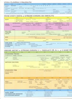 Tabulka - Doplňující školní pomůcka k dějepisnému atlasu. - PRAVĚK Vývoj člověka Hlavní pravěká období v Evropě Naše země v pravěku - STAROVĚK První státy světa Antické Řecko a Řím Periodizace vývoje, …