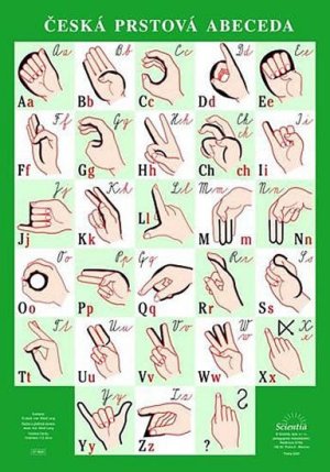 Oboustranná výuková tabule pro nácvik prstové abecedy.