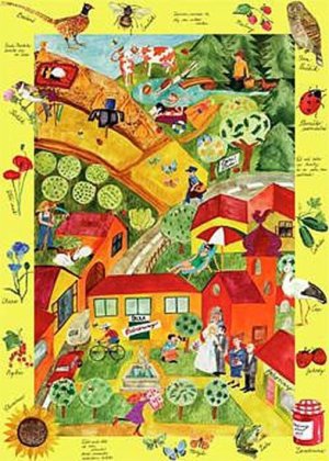 Barevná, oboustranně laminovaná nástěnná tabule zobrazující vesnici Letní Lhotu.