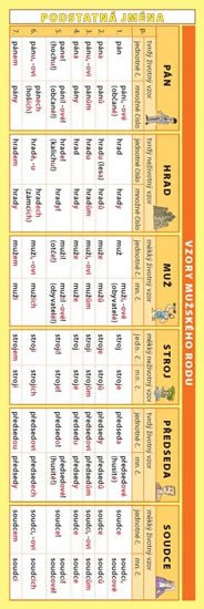Praktická záložka obsahuje vzory mužského, ženského a středního rodu v tabulkách.
