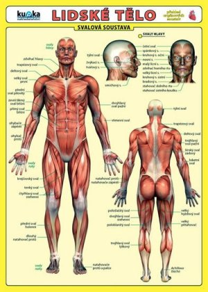 Přehledné anatomické nákresy orgánových soustav člověka (soustava svalová, kosterní, kožní, trávicí, vylučovací, dýchací, rozmnožovací, smyslová, nervová, oběhová, hormonální).