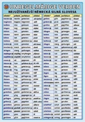 Laminátová kartička určená především pro žáky základních a středních škol nabízí graficky přehledný a stručný přehled těch nejpoužívanějších německých nepravidelných slovech a jejich tvarů.