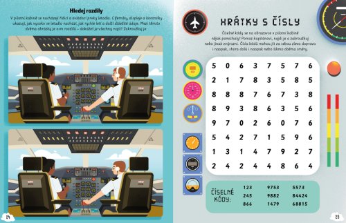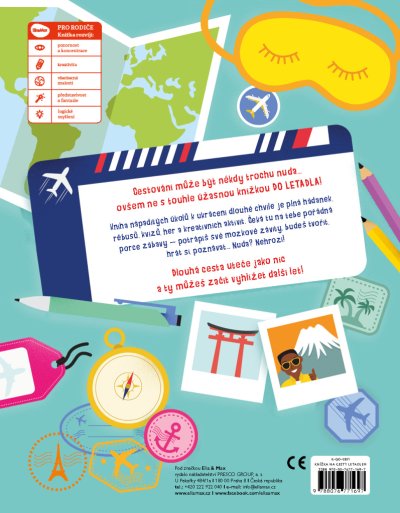 Cestování může být někdy trochu otrava… ovšem ne s touhle úžasnou knížkou DO LETADLA, která je plná nápaditých úkolů k ukrácení dlouhých chvílí! Najdete v ní spoustu hádanek, zapeklitých rébusů, zábavných kvízů, her, kreativních aktivit i zajímavých informací z oblasti cestování letadlem. Čeká tu na vás pořádná porce zábavy – potrápíte své hlavičky, budete tvořit, hrát si, poznávat… Nuda? Nehrozí! Dlouhá cesta uteče jako nic a vy můžete začít vyhlížet další výlet! Práce s knihou navíc rozvíjí představivost, fantazii a kreativitu, ale také pozornost, koncentraci a logické myšlení.