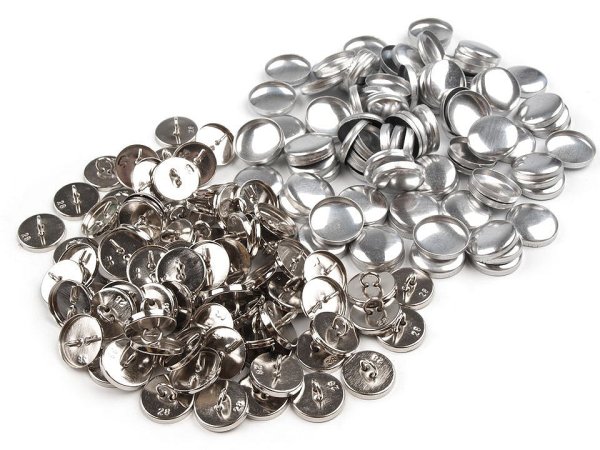 Knoflík na potahování se skládá ze dvou kovových částí - spodní je z magnetického kovu a vrchní z hliníku. Knoflíky mají spodní přišívání. K potažení můžete zvolit různé materiály. Využijí je převážně čalouníci. [Na látku doporučujeme použít výsečník, který najdete pod kódem 750973.]