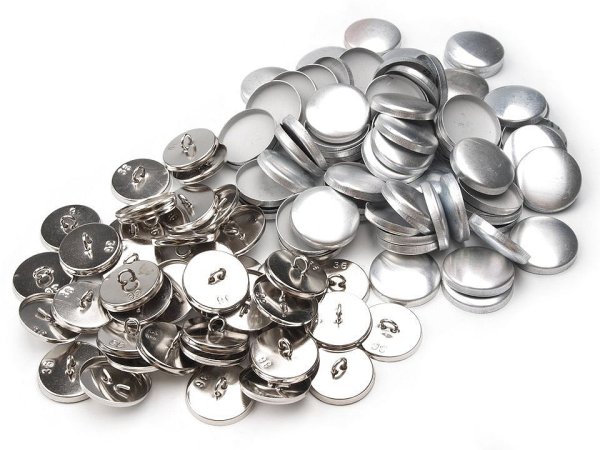 Knoflík na potahování se skládá ze dvou kovových částí - spodní je z magnetického kovu a vrchní z hliníku. Knoflíky mají spodní přišívání. K potažení můžete zvolit různé materiály. Využijí je [převážně] čalouníci.