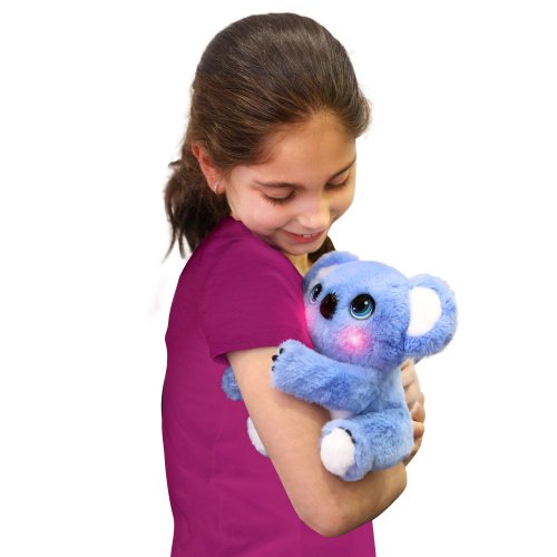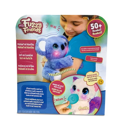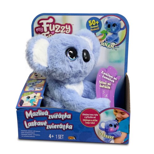 "Roztomilé plyšové zvířátko My Fuzzy Friends Koala. Extra dlouhé ruce a nohy těchto interaktivních mazlíčků se chytí do dětských paží a láskyplně je obejme. Pokud něco koala potřebuje, rozsvítí se jí tvářičky (4 různé barvy) a vydá speciální zvuk. Koala pohybuje hlavou, aby se přitulila jako skutečné zvířecí mládě a má více než 50 zvuků a reakcí. Výrobek vyžaduje 3x AAA baterie, jsou součástí balení. Pro děti od 4let. "