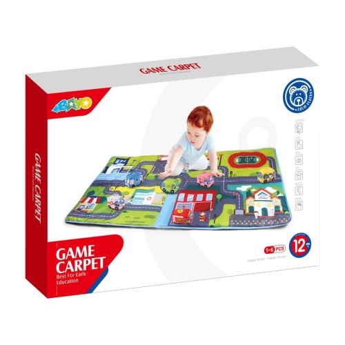 Kobereček na hraní Bayo je nádherný kobereček s motivem města s nádherně vykreslenými cestami, semafory,kruhovým objezdem a budovami. Kobereček doplňuje 6 měkých polštářkových autíček - požárníci policie, autobus, .... Je vhodný pro děti od 12 měsíců. Kobereček chrání od chladné podlahy a má rozměry 80x158 cm.