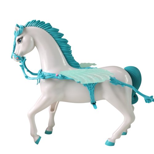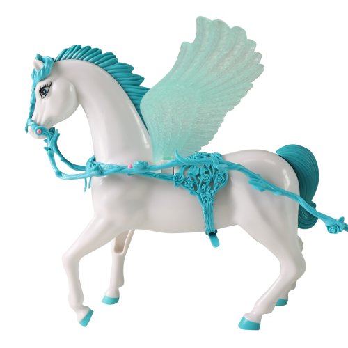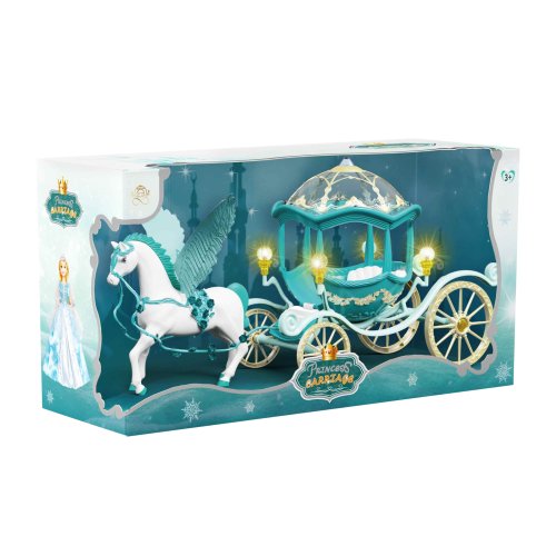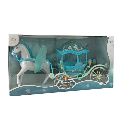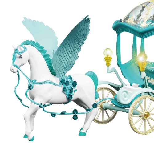 Bílý kůň s křídly zapřáhnutý do pohádkového kočáru. Každá tvá panenka si bude přát vyrazit v něm na zámecký bál! U kočáru po spuštění blikají lampičky. K této funkci je nutné použítí 3x1.5V baterií typu AG13, které jsou součástí .Celková délka kočáru i s koníkem je cca 60 cm.