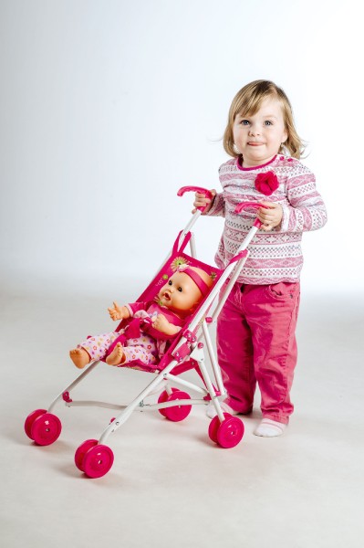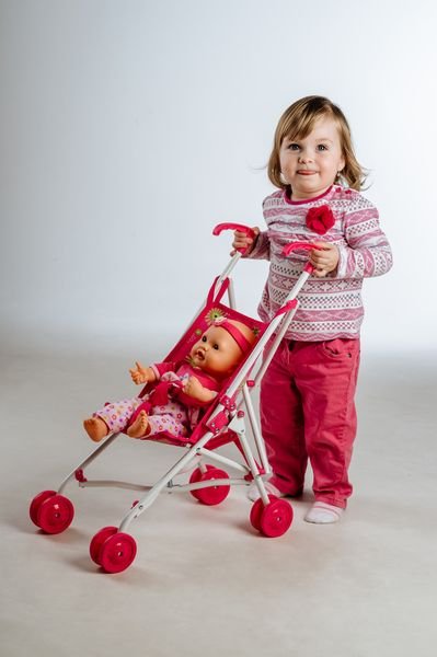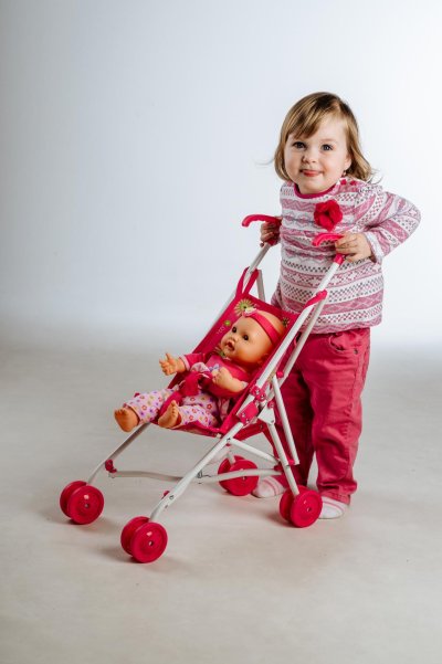 Kočárek pro panenky golfové hole je snadno skládací a lehký. Součástí jsou i bezpečnostní pásy pro panenku. Velikost: 27 x 55 x 52 cm. Vhodný od 3 let.