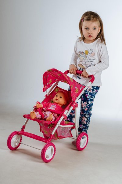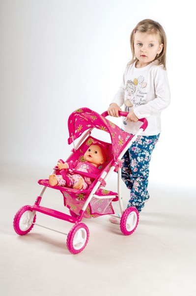 Sportovní kočárek pro panenku se stříškou a úložným prostorem vespod kočárku. Stříšku lze jednoduše sklopit. Rozměr kočárku: 58 x 36 x 62,5 cm Vhodný od 3 let