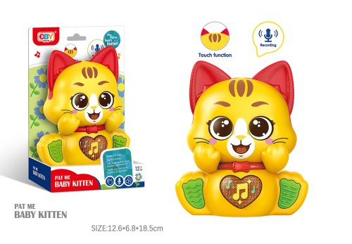 Kočka opakující s efekty. Rozměry 11,8x6,3x13,7 cm. Světelné a zvukové efekty. 2xAAA baterie nejsou součástí. Přepínač ON/OFF na zadní straně. Dotykem čela (horní části hlavy) nebo krátkým stiskem srdíčka - světelné a zvukové efekty. Dlouhý stisk srdíčka - opakuje, co říkám.