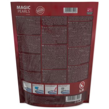 Neparfémované silikátové stelivo pro kočky. Díky mikropórům na sebe stelivo velice rychle váže tekutiny, které uzamkne uvnitř krystalků a eliminuje nepříjemný zápach. Tím zároveň zabraňuje množení nebezpečných bakterií. Díky tomuto inovativnímu procesu má stelivo Magic Pearls extrémní savost a udržuje toaletu suchou a čistou. Stelivo Magic Pearls je bezprašné a neulpívá na tlapkách a srsti zvířat, takže není kočkami vynášeno mimo toaletu. Stelivo je vhodné i pro dlouhosrstá plemena koček. Stelivo Magic Pearls v toaletě vydrží absorbovat pachy a vlhkost až 4 týdny (při použití jednou kočkou), proto je jeho použití také velice ekonomické, není třeba jej měnit tak často jako jiné druhy steliv.