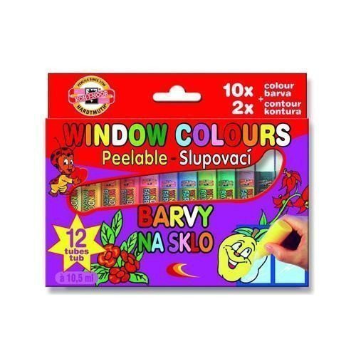 Sada 12 ks 10,5 ml tub v potištěné kartónové skládačce barev na sklo (barvy: bílá, žlutá, světlé modrá, oranžová, červená, tmavě modrá, fialová, světle zelená, tmavě zelená, světlé hnědá, kontura černá, kontura zlatá), přiloženy 2 šablony s motivy na malování, 1 fólie, návod na použití. Barvy na sklo se používají k malování na sklo, zrcadlo, obkladačky a jiné hladké povrchy. Nejprve se barva nanese přímo z tuby na fólii. Po zaschnutí se obrázek z fólie opatrně odtrhne a nalepí na požadovaný povrch. Určeno pro děti starší 3 let. Dítě pozře barvu. Barva projde trávicím traktem bez ovlivnění traktu – dle citlivosti uživatele může vyvolat nevolnost, průjem, zvracení. Obsahuje 10 barev a 2 kontury