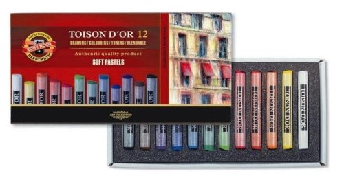 Souprava 12 ks kulatých uměleckých pastelů s ovinem o průměru 10 mm a délce 75 mm. Mají vynikající psací vlastnosti i světlostálost. Při kreslení je možné použít držák pastelů KOH-I-NOOR Versatil. Kresbu doporučujeme po dokončení stabilizovat fixativem.