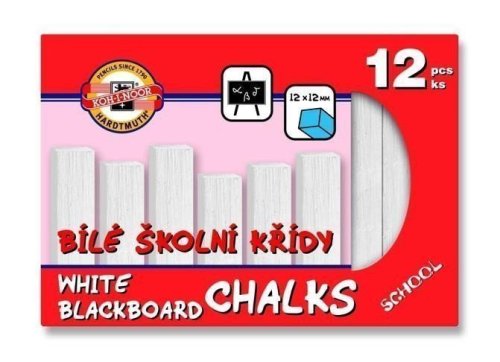 Sada 12 kusů školních bílých čtyřhranných kříd o rozměrech 12x12x100 mm, které jsou určeny pro psaní na školní tabule, vložených do krabičky s potištěnou manžetou a eurozávěsem. Upozornění. Nevhodné pro děti do 3 let. Možnost odlomení malých částí. Nebezpečí zalknutí.