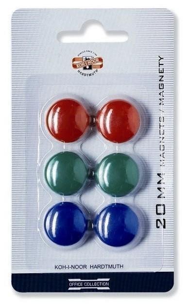 Kulaté magnety 20 mm, průměr magnetu je 20 mm, výška 7 mm. Magnet je plastový, na spodní straně je magnetická ploška. Mix barev. 6 ks magnetů je uloženo v blistru. Magnety se používají na připevnění např. papíru na magnetickou tabuli.
