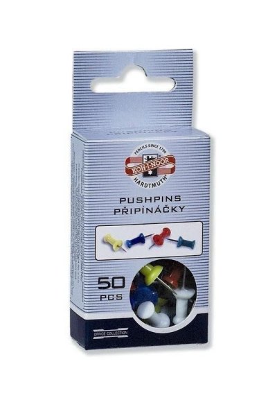 Napínáček s umělohmotným držátkem, výška 23 mm, průměr v nejširším místě 10 mm, umělohmotný držák – mix barev, kovový hrot, 50 ks v papírové krabičce. Používají se na přichycení papírů nebo předmětů např. z látky a ostatních lehčích materiálů na korkovou tabuli.