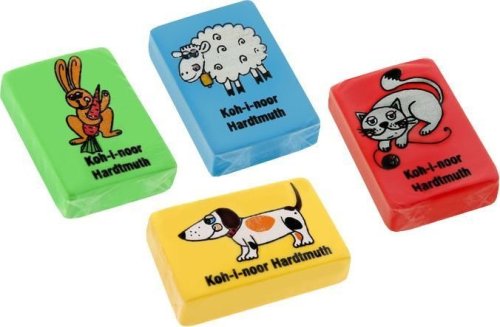 Plastická pryž netvárlivá, vhodná pro stírání grafitových čar. Hranatá, kvádrová, různé barevné modifikace. Zelená pryž - barevný obrázek zajíce, červená pryž - barevný obrázek kočky, modrá pryž - barevný obrázek ovce, žlutá pryž - barevný obrázek psa. Balení obsahuje 1 ks pryže. Fotografie jsou pouze ilustrativní, druh pryže dodáváme dle skladových zásob. Rozměry pryže:4,5 x 3 x 1 cm