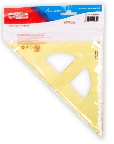 Trojúhelník 45/177 s kolmicí vyrobený ze žlutého průhledného polystyrenu. Stupnice je naražena technologií horké ražby. Přesnost stupnice 0,2% délky. Mimo délkové stupnice je vybaven i ryskou pro konstruování kolmic. Trojúhelník je určený k rýsování a technickému kreslení ve škole i v kanceláři. Zabalen je do polyetylenového sáčku s eurozávěsem.
