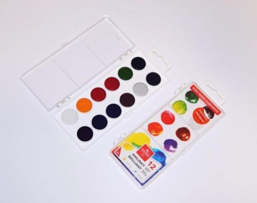 Vodové barvy o průměru tablet 22,5 mm s 12ti brilantními odstíny vhodné pro speciální výtvarné techniky, např. pro kolorování fotografií, malby portrétů, malbě na dekorační předměty, zdobení kraslic aj.. Vložené v plastovém barevníku s transparentním víčkem.
