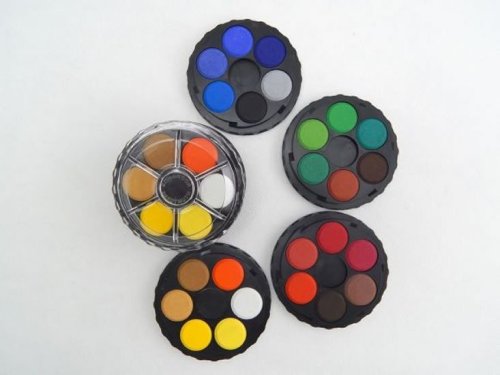 Školní vodové barvy 24 odstínů s tabletami o průměru 22,5 mm v kulatých, plastových, čtyřpatrových barevnících. Barvy jsou výrazné, vyznačují se svým vysokým obsahem pigmentů. Jsou certifikované a zcela bezpečné pro děti.