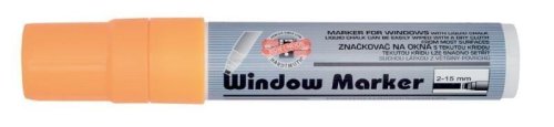 Značkovač na okna s tekutou křídou oranžový, s oranžovým uzávěrem, plochý hrot, šíře stopy 2 - 15 mm. Rozměr délka 161 mm, o 26 mm , uzávěr – šírší konec o 29 mm.