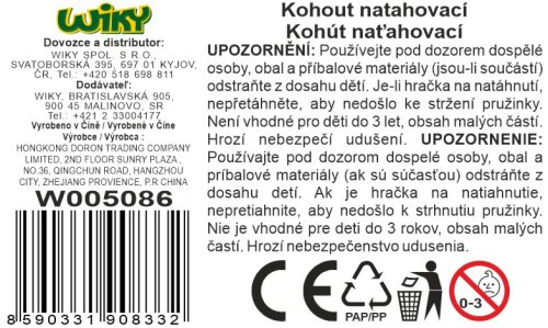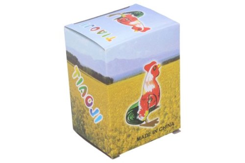 Pohyb plechového kohoutka zajišťuje pérový strojek natahovaný klíčkem. Rozměry balení 6 x 9 x 5 cm. Vhodné pro děti od 3 let.