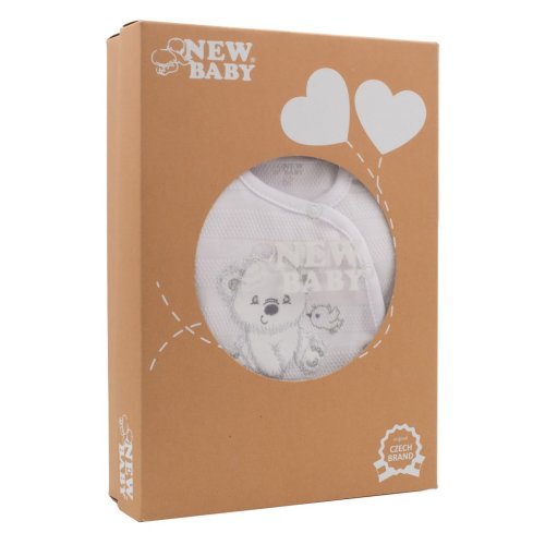 4-dílná soupravička české značky New Baby Sweet Bear pro miminka. Soupravička je vyrobena z kvalitního materiálu, který je vhodný pro miminka a je vhodná nejen do porodnice. Obsahuje celorozepínací body s dlouhým rukávkem, dupačky, kabátek a čepičku. Celorozepínací body zdobí vyšitý obrázek medvídka a ptáčka. Dupačky zdobí roztomilý obrázek medvídka a ptáčka. Zapínání na cvočky na ramínkách a mezi nožičkami. Kabátek je jednobarevný s krásným lemováním okolo ručiček. Zapínání je na cvočky po celé délce. Čepička je krásně tvarovaná na ouška a zavazuje se na tkaničky. Soupravička je v praktické Eko krabičce. Celá soupravička má nový neobyčejný design s atraktivním vzorem látky. Složení: 100% bavlna.