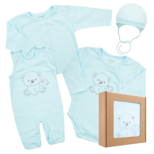 4-dílná soupravička české značky New Baby Sweet Bear pro miminka. Soupravička je vyrobena z kvalitního materiálu, který je vhodný pro miminka a je vhodná nejen do porodnice. Obsahuje celorozepínací body s dlouhým rukávkem, dupačky, kabátek a čepičku. Celorozepínací body zdobí vyšitý obrázek medvídka a ptáčka. Dupačky zdobí roztomilý obrázek medvídka a ptáčka. Zapínání na cvočky na ramínkách a mezi nožičkami. Kabátek je jednobarevný s krásným lemováním okolo ručiček. Zapínání je na cvočky po celé délce. Čepička je krásně tvarovaná na ouška a zavazuje se na tkaničky. Soupravička je v praktické Eko krabičce. Celá soupravička má nový neobyčejný design s atraktivním vzorem látky. Složení: 100% bavlna.
