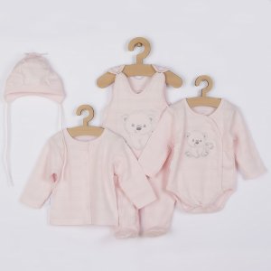 4-dílná soupravička české značky New Baby Sweet Bear pro miminka. Soupravička je vyrobena z kvalitního materiálu, který je vhodný pro miminka a je vhodná nejen do porodnice. Obsahuje celorozepínací body s dlouhým rukávkem, dupačky, kabátek a čepičku. Celorozepínací body zdobí vyšitý obrázek medvídka a ptáčka. Dupačky zdobí roztomilý obrázek medvídka a ptáčka. Zapínání na cvočky na ramínkách a mezi nožičkami. Kabátek je jednobarevný s krásným lemováním okolo ručiček. Zapínání je na cvočky po celé délce. Čepička je krásně tvarovaná na ouška a zavazuje se na tkaničky. Soupravička je v praktické Eko krabičce. Celá soupravička má nový neobyčejný design s atraktivním vzorem látky. Složení: 100% bavlna.