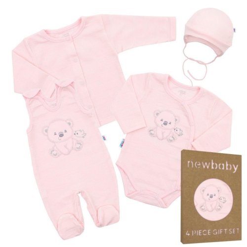 4-dílná soupravička české značky New Baby Sweet Bear pro miminka. Soupravička je vyrobena z kvalitního materiálu, který je vhodný pro miminka a je vhodná nejen do porodnice. Obsahuje celorozepínací body s dlouhým rukávkem, dupačky, kabátek a čepičku. Celorozepínací body zdobí vyšitý obrázek medvídka a ptáčka. Dupačky zdobí roztomilý obrázek medvídka a ptáčka. Zapínání na cvočky na ramínkách a mezi nožičkami. Kabátek je jednobarevný s krásným lemováním okolo ručiček. Zapínání je na cvočky po celé délce. Čepička je krásně tvarovaná na ouška a zavazuje se na tkaničky. Soupravička je v praktické Eko krabičce. Celá soupravička má nový neobyčejný design s atraktivním vzorem látky. Složení: 100% bavlna.