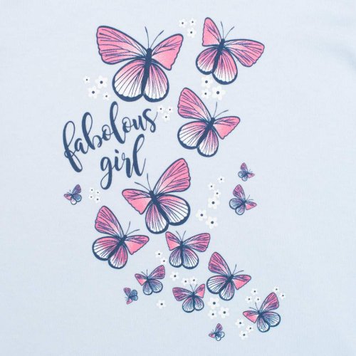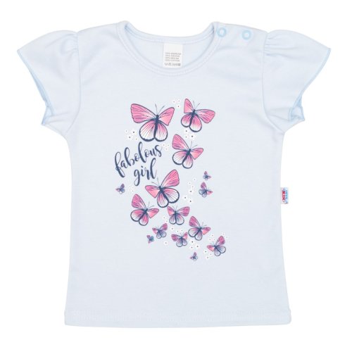2-dílna soupravička pro holčičky české značky New Baby Butterflies. Soupravička se skládá z trička a sukýnky. Tričko s krátkými nařasenými rukávy je zdobeno obrázkem motýlků. Zapínání na ramínku na cvočky ulehčí oblékání přes hlavičku miminka. Tmavě modrou sukýnku zdobí krásný volánek, který dodává sukýnce ten správný šmrnc. V pase je širší guma, která netlačí na bříško miminka. Složení: tričko: 100% bavlna, sukýnka: 95% bavlna, 5% elastan.