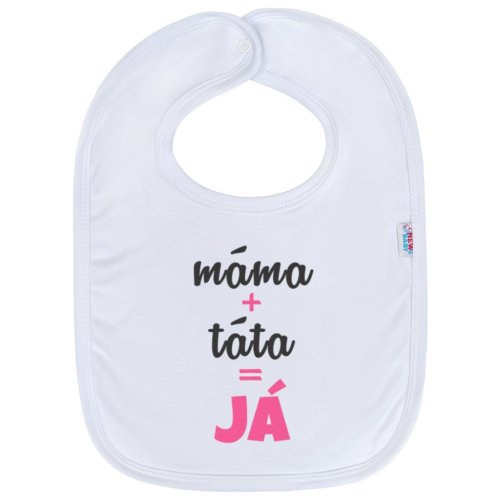 Krásný bavlněný dětský bryndáček s vtipným obrázkem New Baby. Bryndáček je zdoben nápisem máma+táta=JÁ. Barvy použité k potisku jsou certifikované a vhodné pro miminka. Je vyroben z příjemného a kvalitního materiálu. Bryndáček má bílé lemování a je vyroben ze dvou vrstev bavlněné látky. Zapínání na cvoček. Dětský bryndáček chrání oblečení miminka před znečištěním při jídle a pití. Složení: 100 % bavlna. Rozměry: dxs cca 36x26 cm.<BR>- Produkt české značky