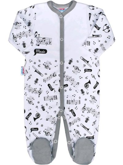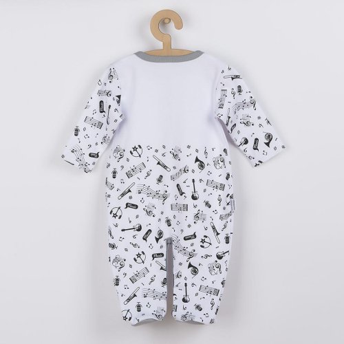 Bavlněný kojenecký overal New Baby Music pro miminka. Dětský overálek má rukávky a spodní část celopotištěnou notičkami a hudebními nástroji. Vrchní část je zdobena roztomilým obrázkem notiček a nápisem Music. Zapínání na cvočky po celé délce a mezi nožičkami. Klademe důraz na kvalitu a proto se díky příjemnému, měkkému a kvalitnímu materiálu, bude Vaše miminko cítit velmi příjemně. Náš overálek je vhodný pro kluky i holčičky. Složení: 100% bavlna. Rozměry: obvod kolem hrudníku cca 54 cm, celková délka cca 65 cm, délka od rozkroku cca 21 cm, délka rukávú cca 25 cm.