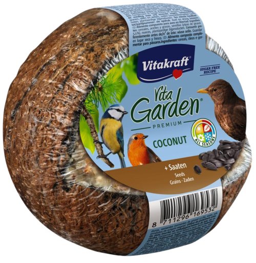 Doplňkové krmivo pro zahradní ptactvo. Kokosy VITA GARDEN® jsou bohaté na tuky, obiloviny a chutná semena. Cenný doplněk stravy volně žijících zahradních ptáků po celý rok. Receptura bez cukru. Neobsahuje umělá barviva ani konzervační látky.