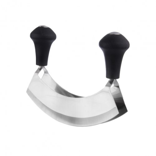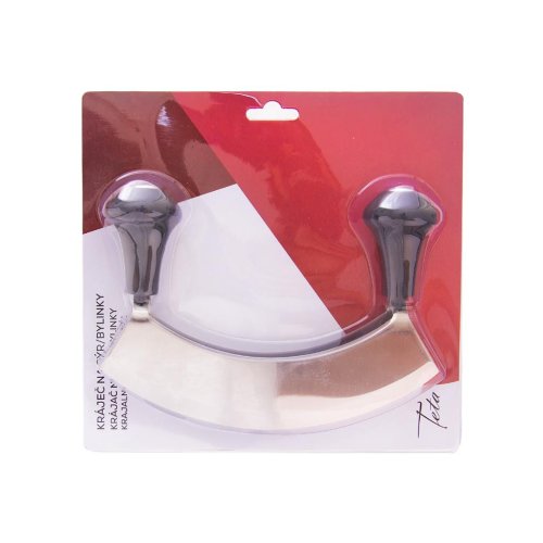 Kutr na sekání masa, sýrů a zeleniny. 2 nerezové sekáčky délky 17 cm. 2 plastové koule jako madlo. Výška 12 cm. EAN 8592381150228