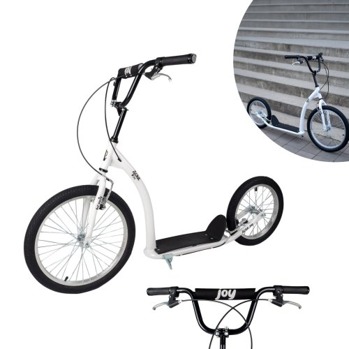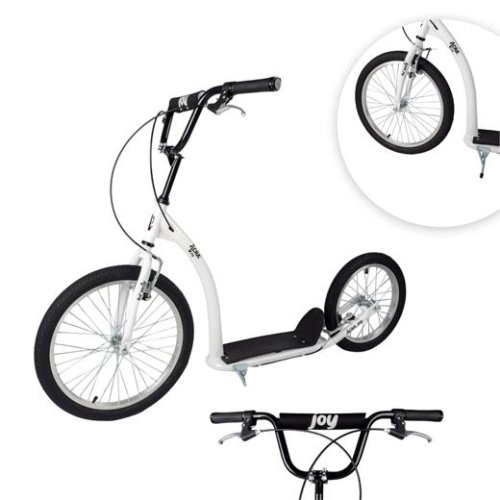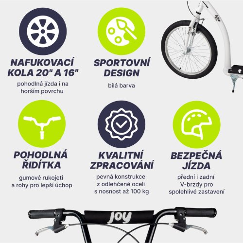 Poohlížíte se po rychlé koloběžce se stylovým designem? Sportovní koloběžka Acra Joy Aven je vhodná pro začátečníky i pokročilé jezdce. Využijete ji jak pro jízdu po silnici, tak na cyklostezce nebo v lehkém terénu. Pohodlně s ní dojedete do školy nebo do práce. Má nafukovací kola o velikosti 20” (přední) a 16” (zadní). Kvalitní rám z odlehčené oceli uveze jezdce o hmotnosti do 100 kg.